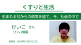 【3/6配信】くすりと生活 172 ~精巣がんに罹患経験のある方を迎えて 配信情報 2026.02.272026.03.06 配信日時2026年3月6日(金) 12:00~13:00ゲストじゅんさん疾患精巣がん閲覧方法・配信日時に下記ボタンからZOOMへアクセス(赤ボタン)・協賛企業・協賛者は配信翌週より閲覧可能・上記以外の方は配信日翌日より翌週木曜日まで閲覧可能(青ボタン) リアルタイム配信の閲覧はこちら (配信日時のみ有効)ZOOMを使います(パスコードは 2026 ) 期間限定の閲覧はこちら (配信日の翌日から翌木曜日のみ有効)youtubeを使います(対談動画のみ配信)