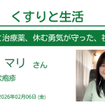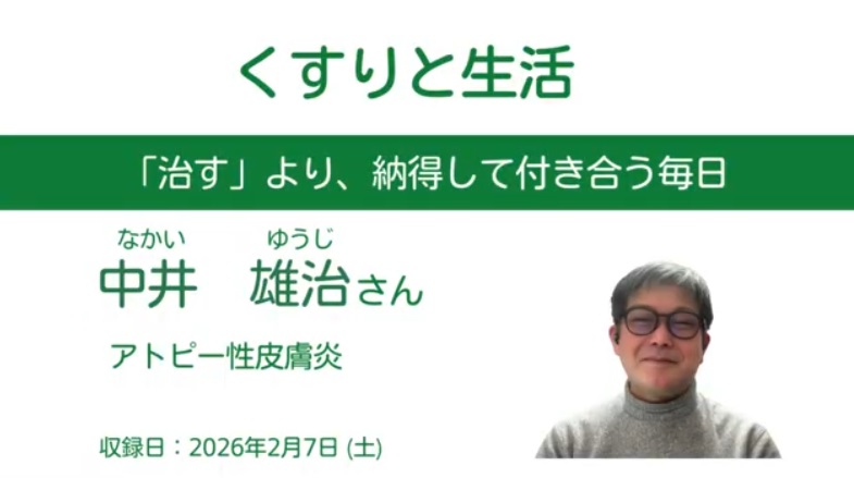 【3/13配信】くすりと生活 173 ~アトピー性皮膚炎に罹患している方を迎えて 配信情報 2026.03.062026.03.13 配信日時2026年3月13日(金) 12:00~13:00ゲスト中井雄治さん疾患アトピー性皮膚炎閲覧方法・配信日時に下記ボタンからZOOMへアクセス(赤ボタン)・協賛企業・協賛者は配信翌週より閲覧可能・上記以外の方は配信日翌日より翌週木曜日まで閲覧可能(青ボタン) リアルタイム配信の閲覧はこちら (配信日時のみ有効)ZOOMを使います(パスコードは 2026 ) 期間限定の閲覧はこちら (配信日の翌日から翌木曜日のみ有効)youtubeを使います(対談動画のみ配信)