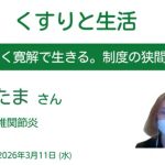 【4/10配信】くすりと生活 176 ~リンパ管腫に罹患経験がある方を迎えて 配信情報 2026.04.032026.04.10 配信日時2026年4月10日(金) 12:00~13:00ゲストけいご さん疾患リンパ管腫閲覧方法・配信日時に下記ボタンからZOOMへアクセス(赤ボタン)・協賛企業・協賛者は配信翌週より閲覧可能・上記以外の方は配信日翌日より翌週木曜日まで閲覧可能(青ボタン) リアルタイム配信の閲覧はこちら (配信日時のみ有効)ZOOMを使います(パスコードは 2026 ) 期間限定の閲覧はこちら (配信日の翌日から翌木曜日のみ有効)youtubeを使います(対談動画のみ配信)