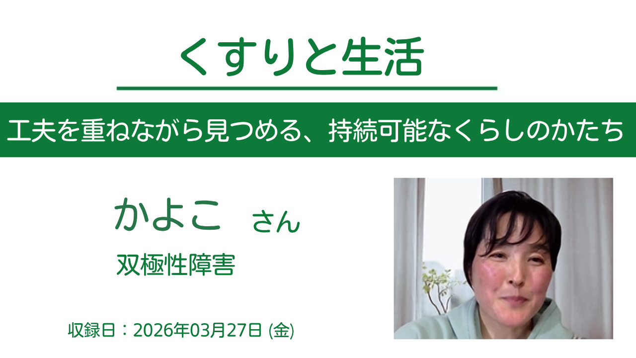【5/8配信】くすりと生活 179 ~双極性障害に罹患している方を迎えて 配信情報 2026.04.24 配信日時2026年5月8日(金) 12:00~13:00ゲストかよこさん疾患双極性障害閲覧方法・配信日時に下記ボタンからZOOMへアクセス(赤ボタン)・協賛企業・協賛者は配信翌週より閲覧可能・上記以外の方は配信日翌日より翌週木曜日まで閲覧可能(青ボタン) リアルタイム配信の閲覧はこちら (配信日時のみ有効)ZOOMを使います(パスコードは 2026 ) 期間限定の閲覧はこちら (配信日の翌日から翌木曜日のみ有効)youtubeを使います(対談動画のみ配信)